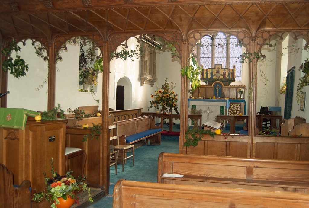 The interior, decorated for Harvest.