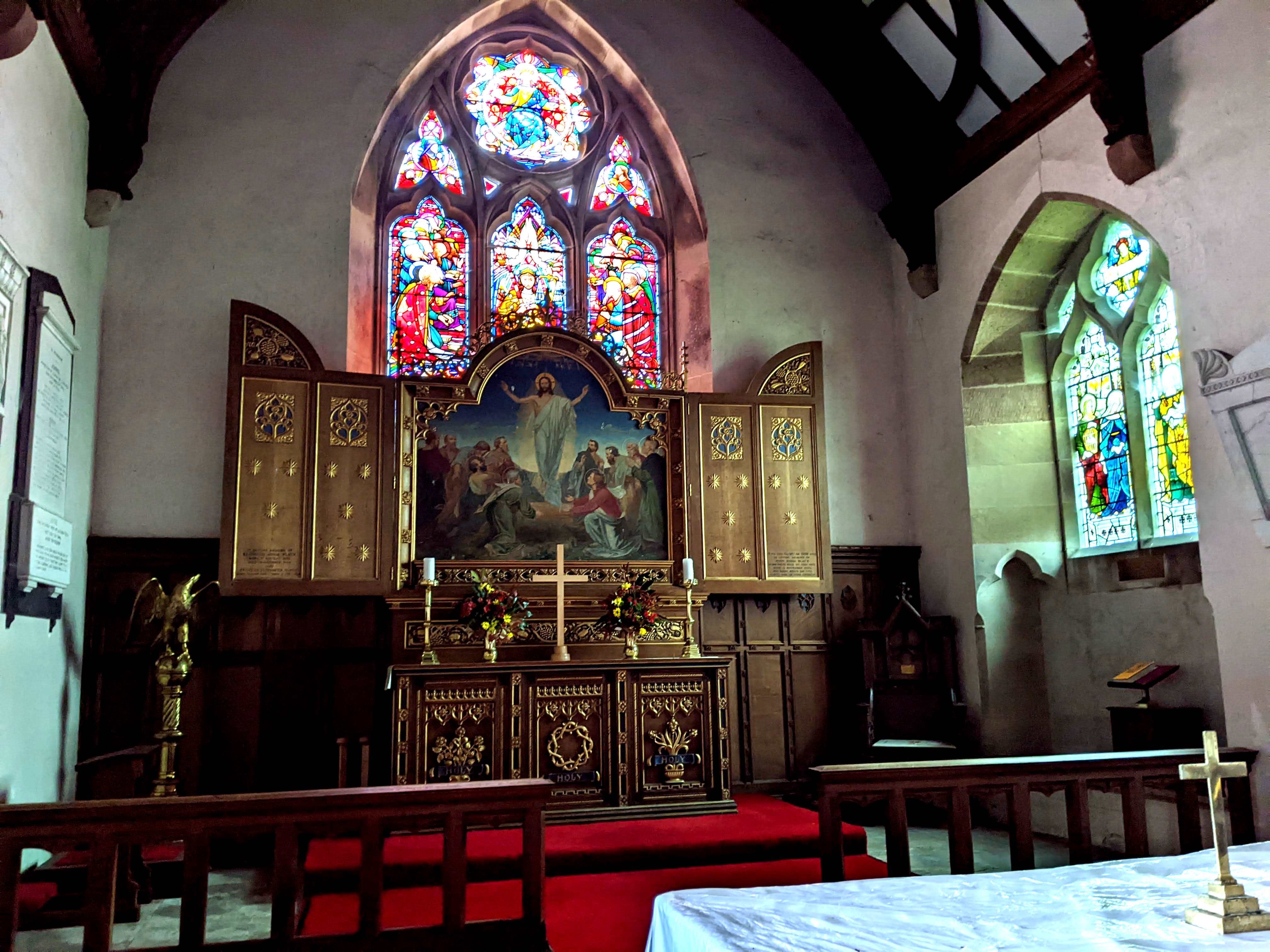 The chancel (left) is Victorian and richly decorated with some fine glass. Opinion is divided as to whether the reredos should hide the east window.