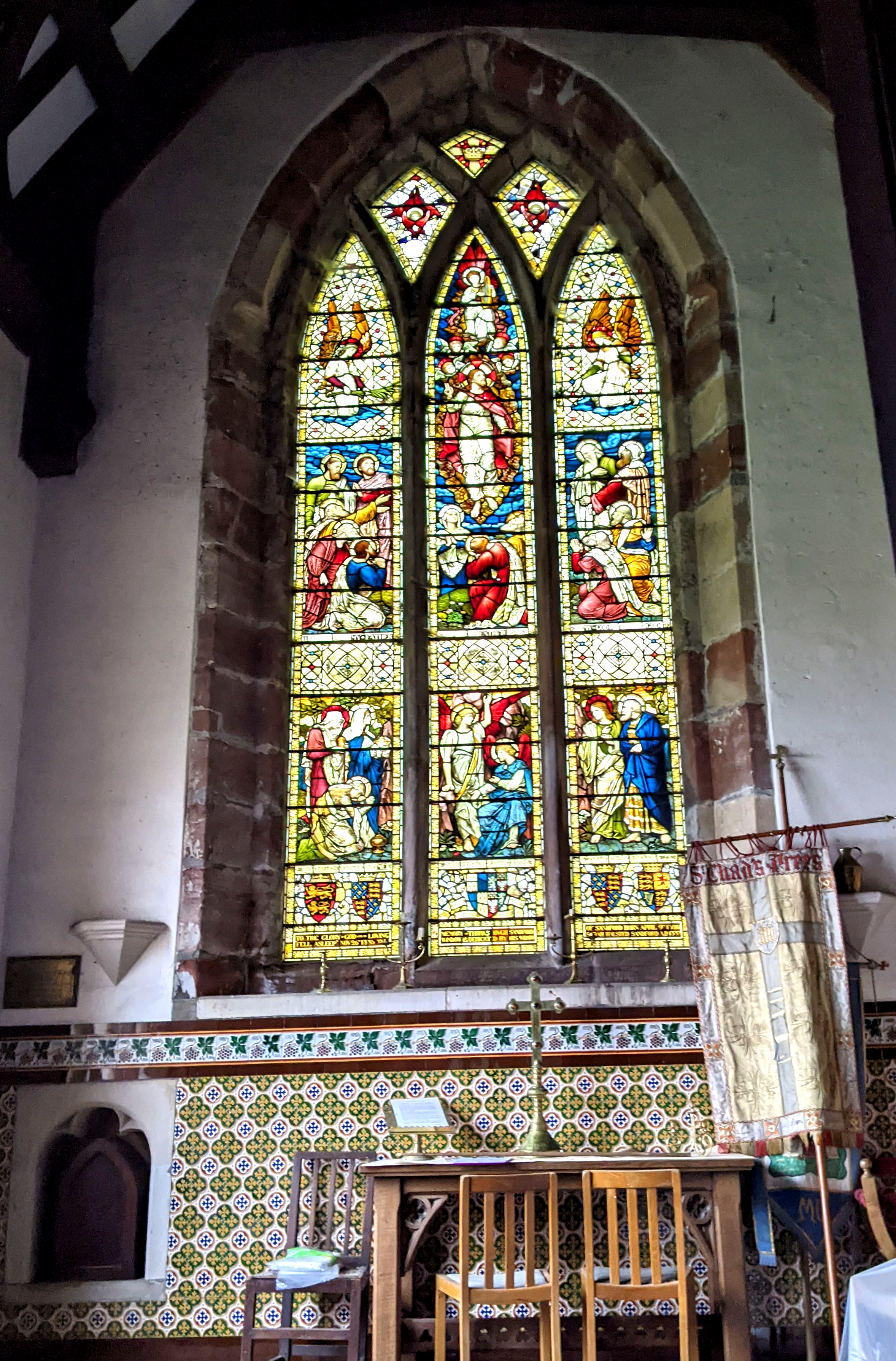 In the Sandford chapel in the north aisle (right), is another notable window which includes fragments of medieval glass brought to Prees from the site of the Battle of Shrewsbury, 1403. Below it is a piscina and some fine Victorian tiles.