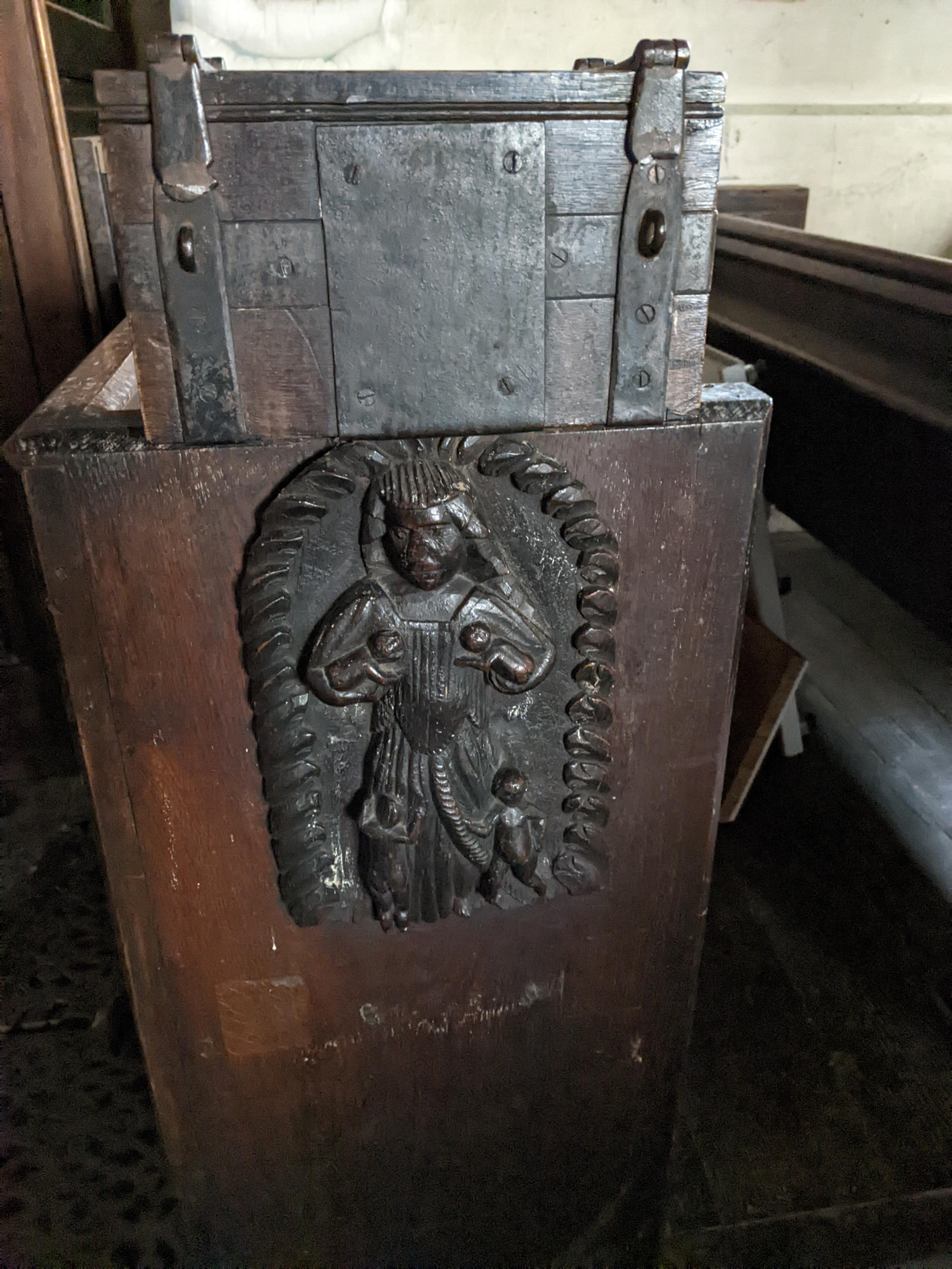 Probably C16 or early C17, it is on the end of a pew near the north door.