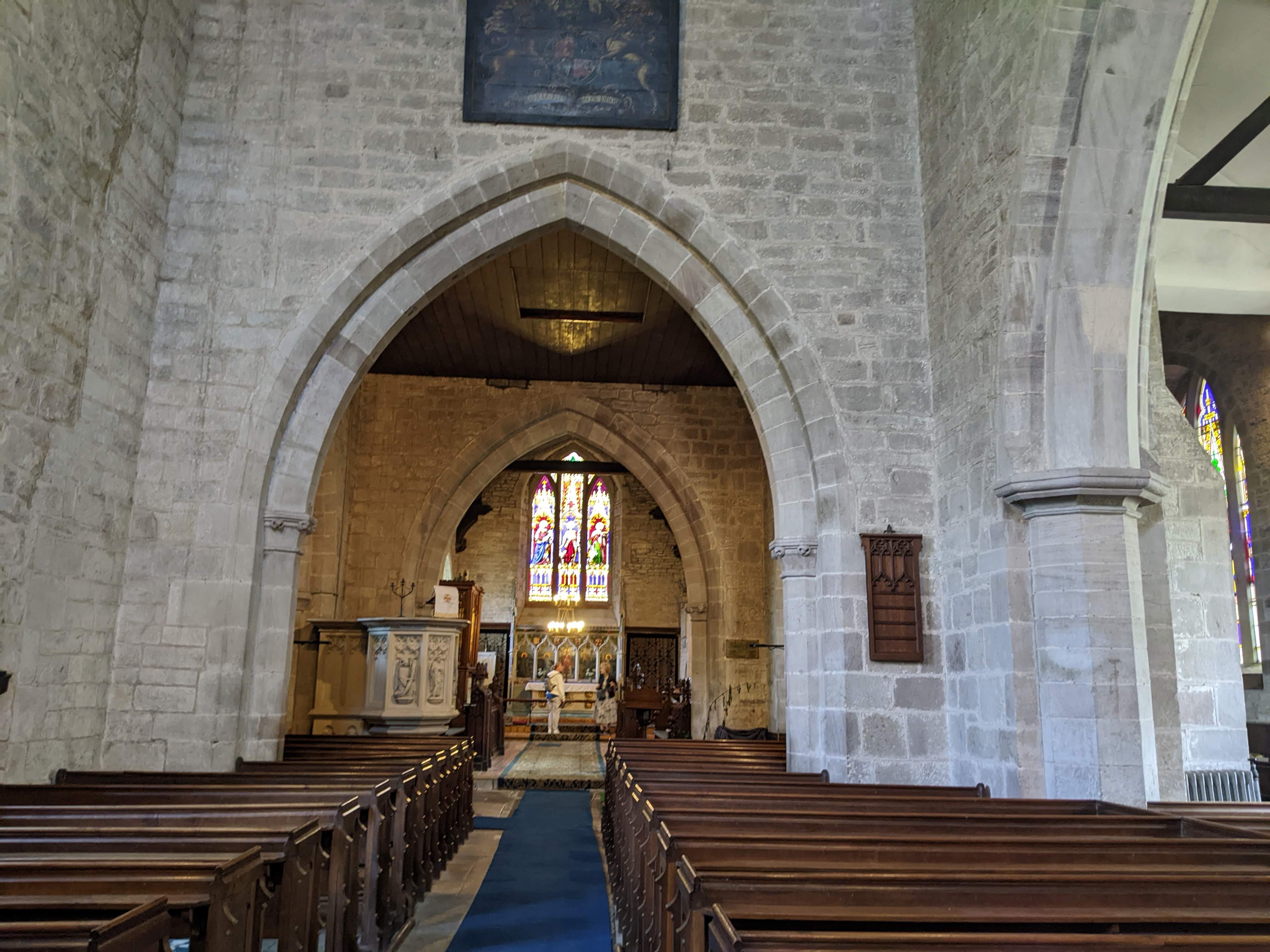 The chancel is 13th century with the tower and south transept built a century later. There are many highly coloured windows.