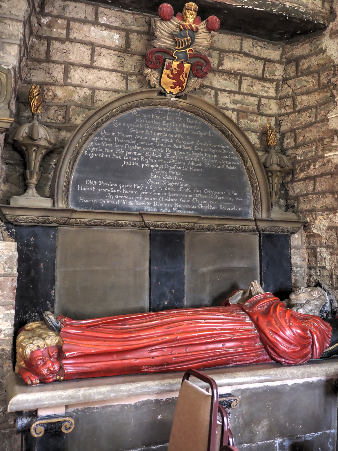 There is a tomb chest with the recumbent effiigy of Sir Job Charlton, a distinguished 17th century judge, his feet resting on a red lion. The judge