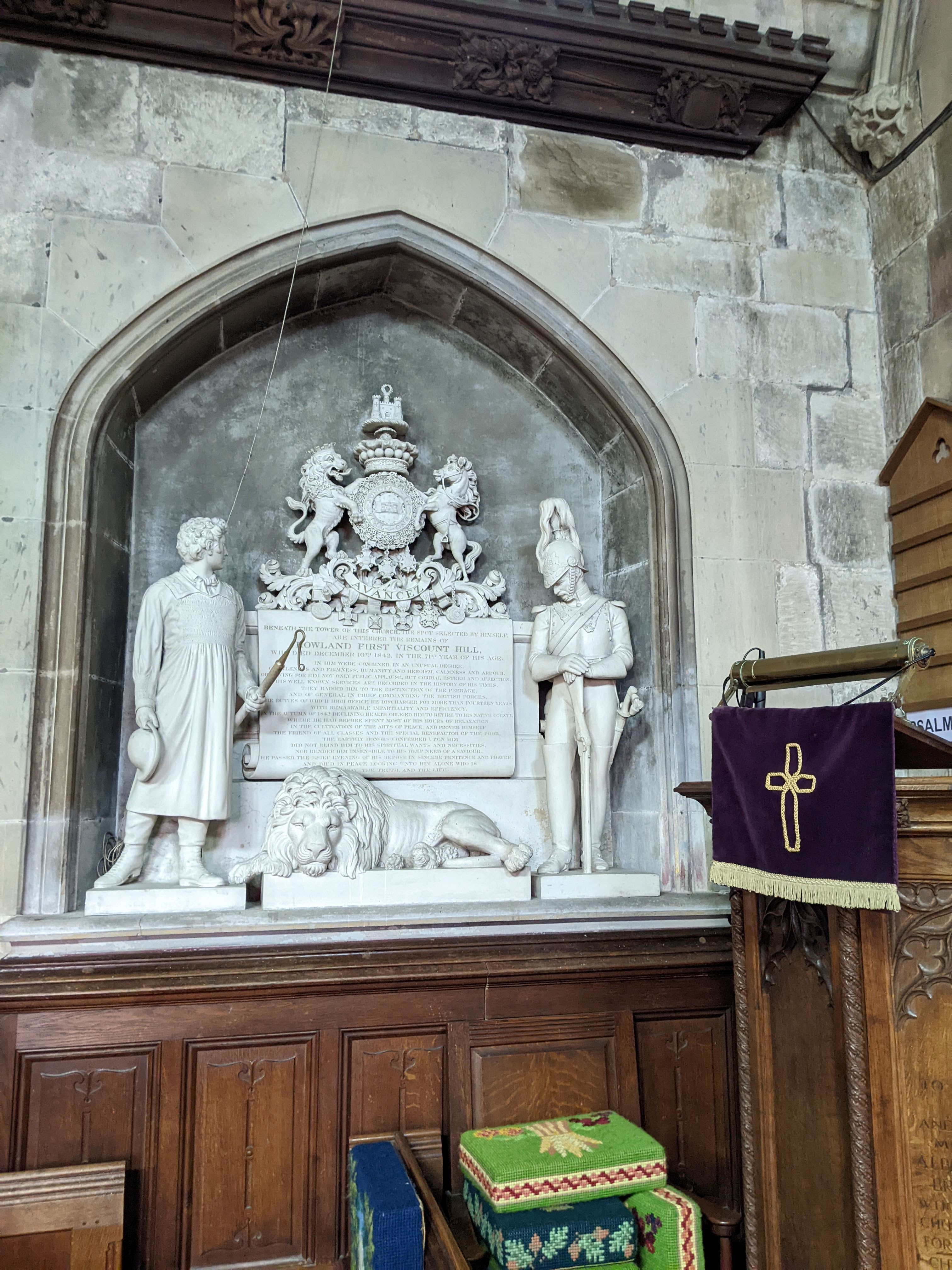 The church contains a Monument dedicated to Lord Rowland Hill who served at Waterloo. He is buried in a sealed crypt beneath the tower, together, it is thought, with his sisters.