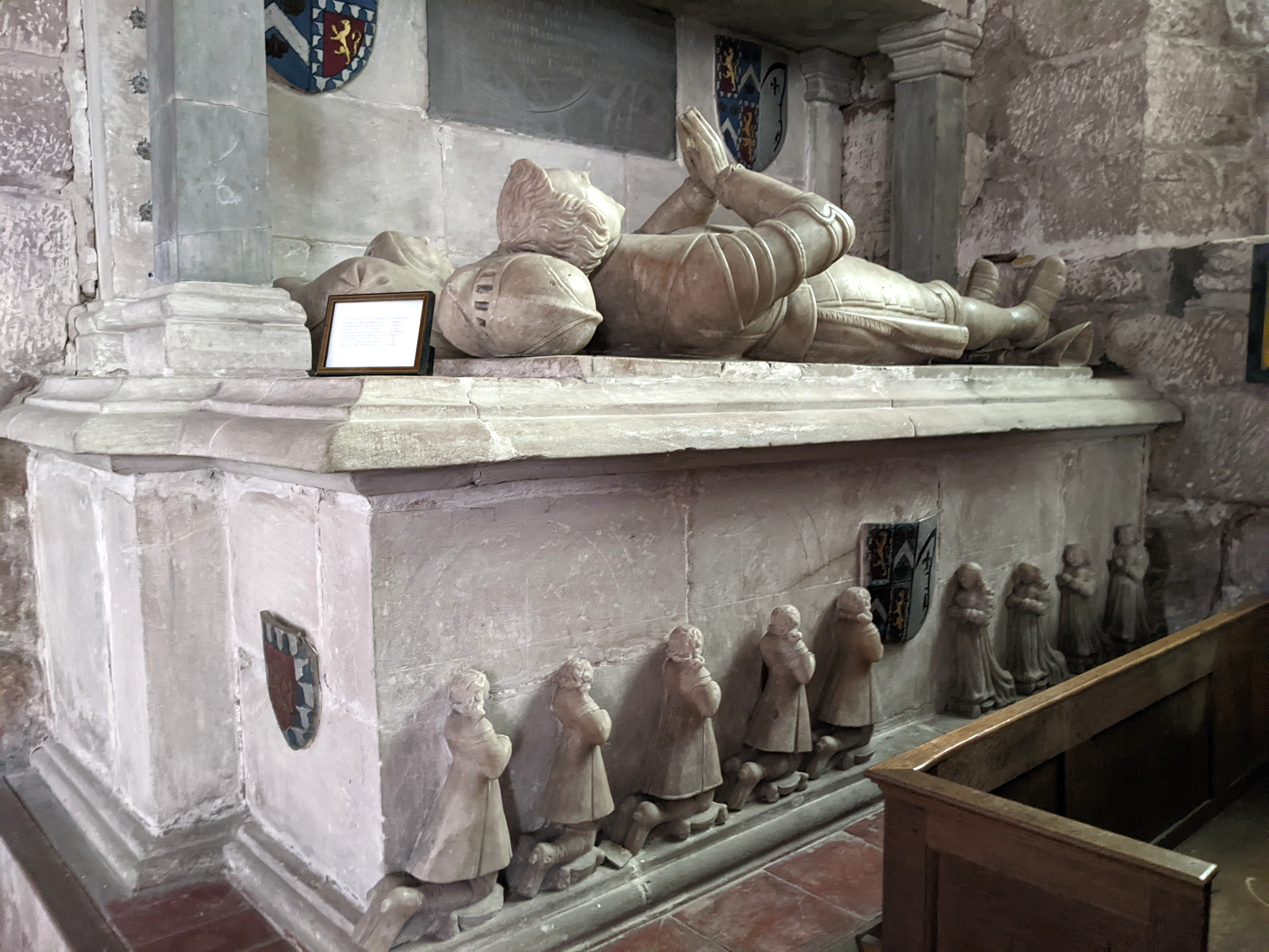 The most prominent monument is the alabaster tomb of Thomas Skrymsher, Knight of Aqualate and his wife Anne and family.