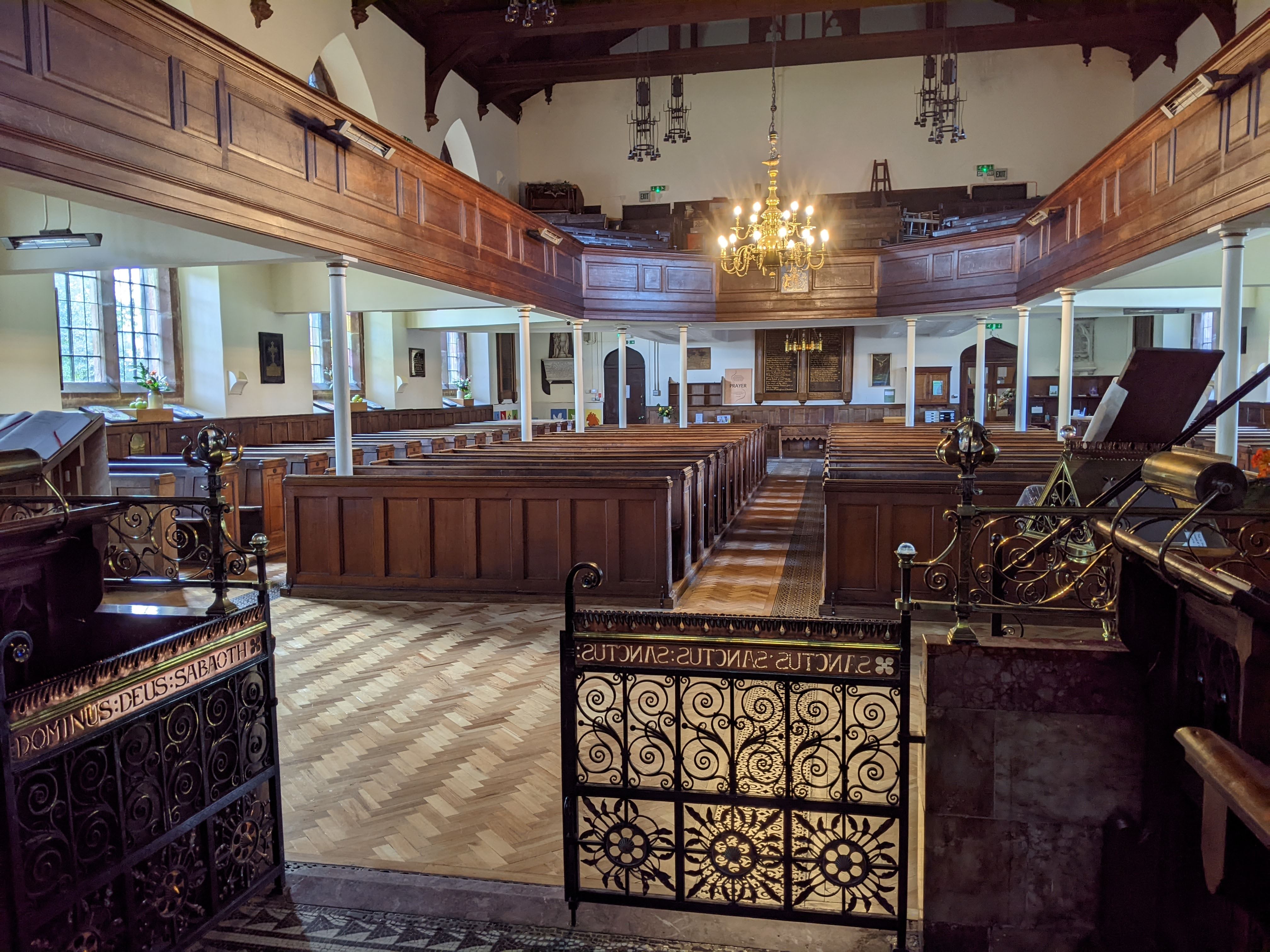 The interior, looking west. The spacious gallery has slender cast iron columns