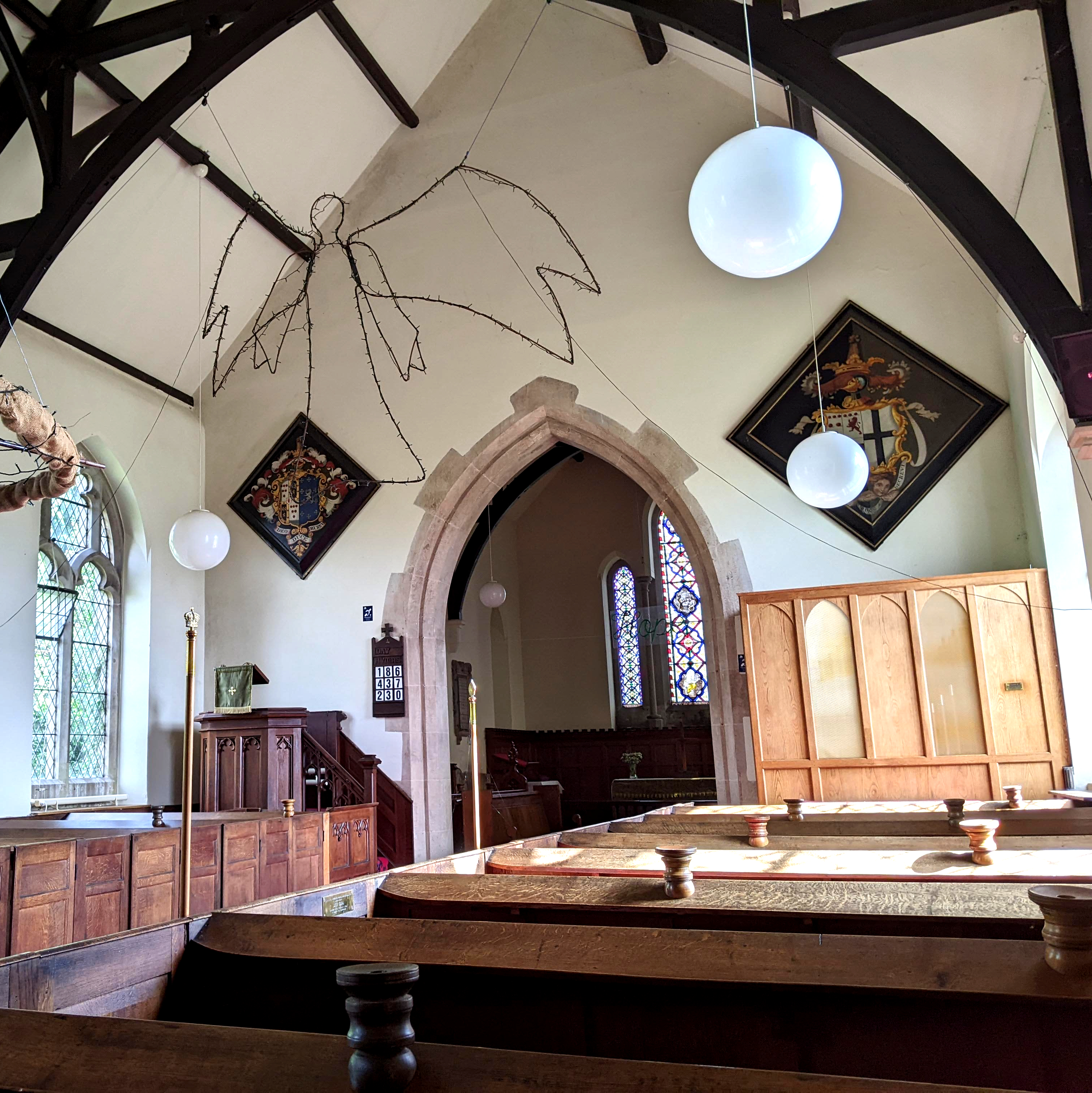 The welcoming interior of Harley church. The oak box pews are from the 18th century. In the rebuild of 1845, it is said that they were moved to the sides of the nave to allow for benches in the centre aisle.
