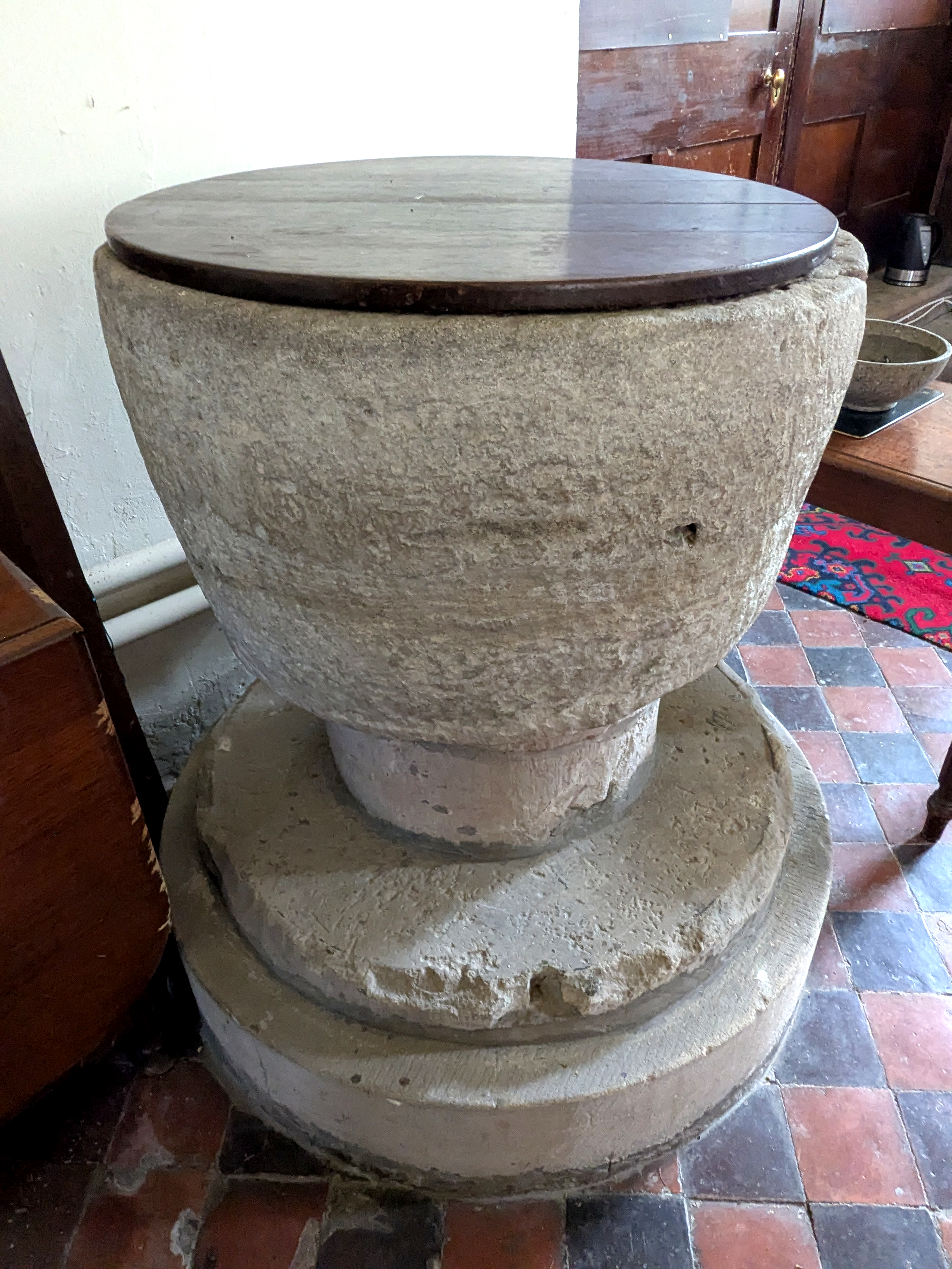 The large Norman tub font, presumably from the earlier church.
