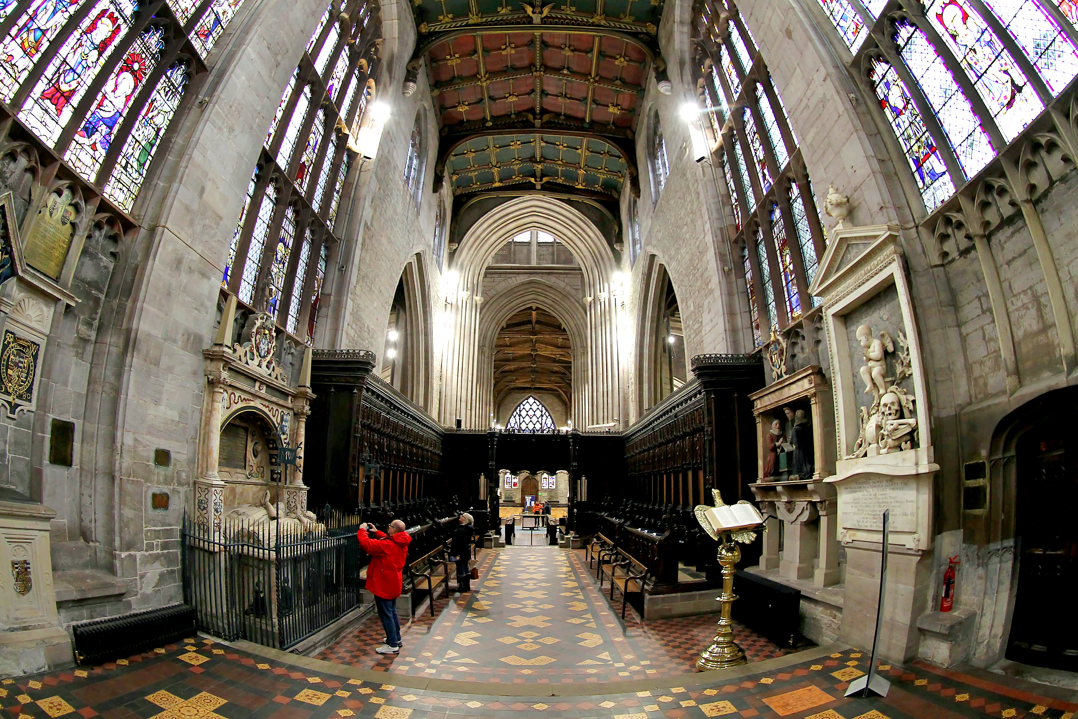 an extensive set of misericords, late mediaeval stained glass windows and an impressive tower which is open to the public with spectacular views of town and countryside.