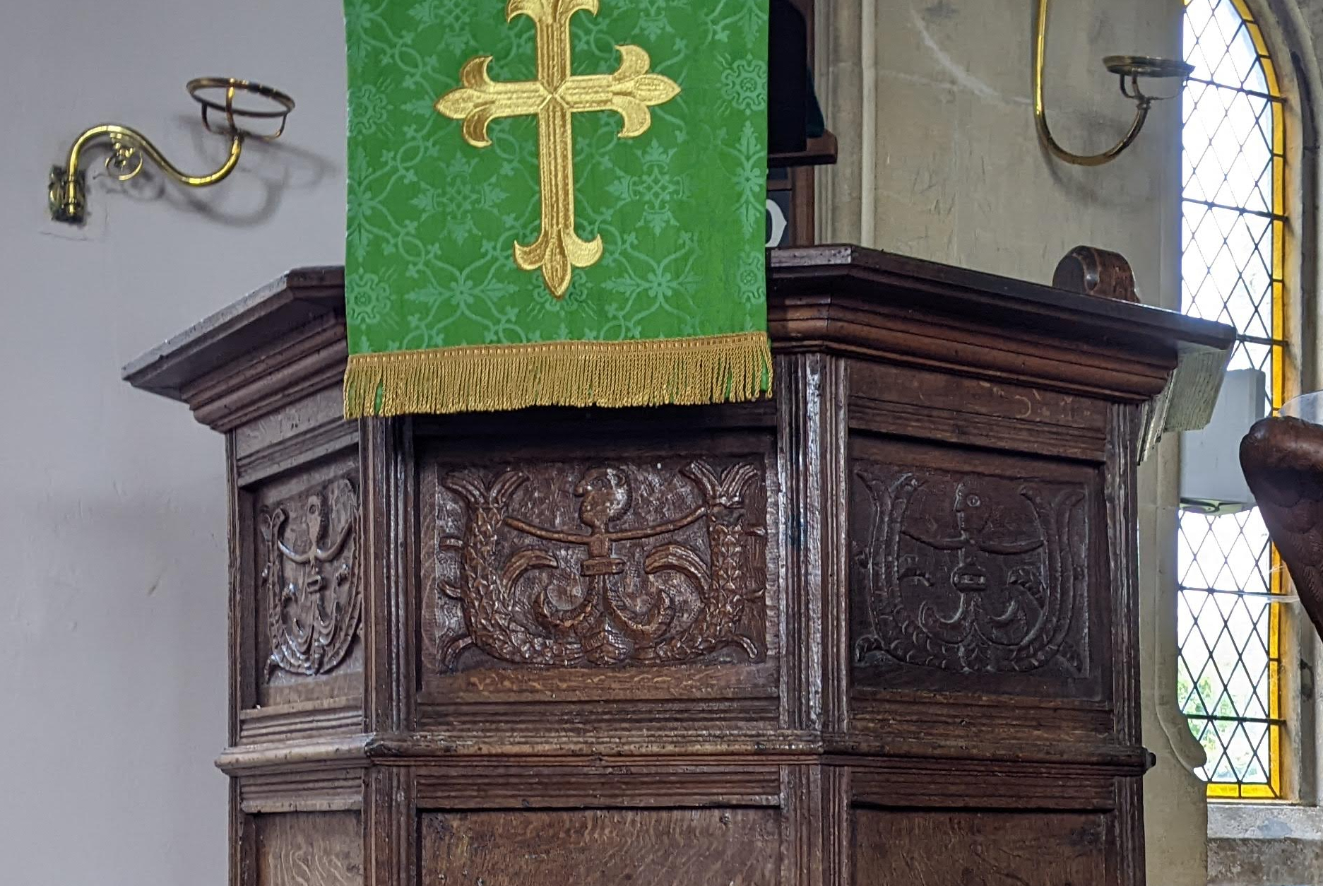 There is an unusual carved Jacobean pulpit, with a merman on each panel. There are two splayed Norman windows.